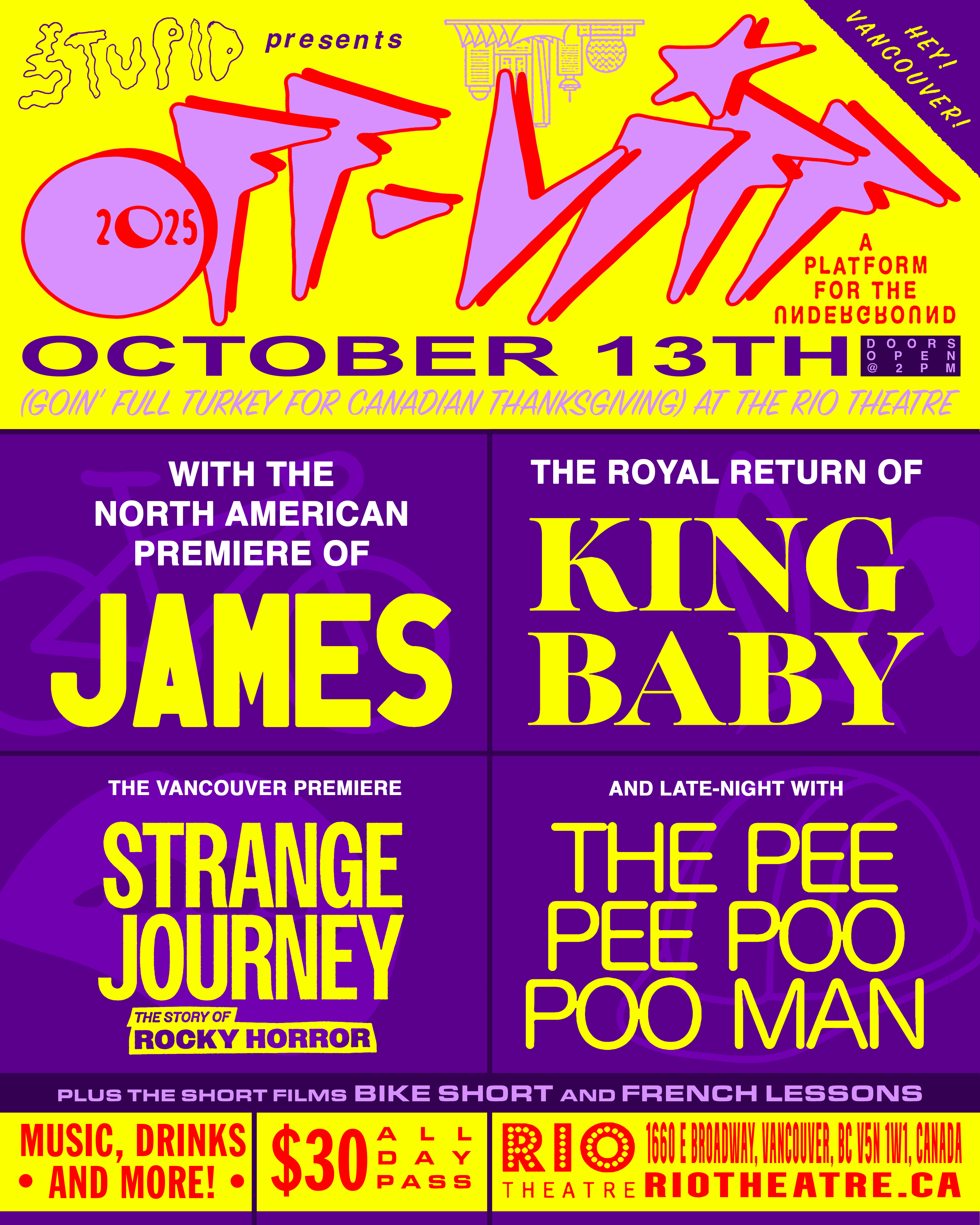 This year is four times as big, a full-day event featuring the North American Premiere of JAMES from hometown filmmaking team at Damcove Films, the royal return of KING BABY, the Vancouver Premiere of STRANGE JOURNEY: THE STORY OF ROCKY HORROR, and late-night with THE PEE PEE POO POO MAN. Plus short films including BIKE SHORT and FRENCH LESSONS. We tried to stick to our original mission of showing BC-made features, Canadian upcoming talent, independent and DIY filmmaking. Ultimately we want to just have fun and inspire fun!